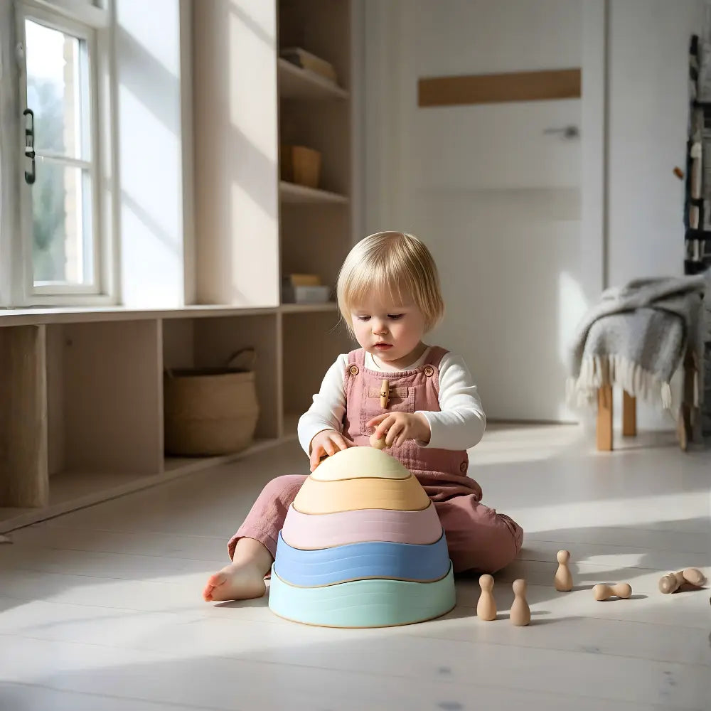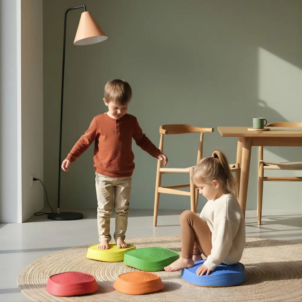 "The tactile sense, muscle and joint senses are engaged when playing with the tumbling stones. They train the activation of the small, joint-near muscles around the ankle, knee, and hip, which create stability."