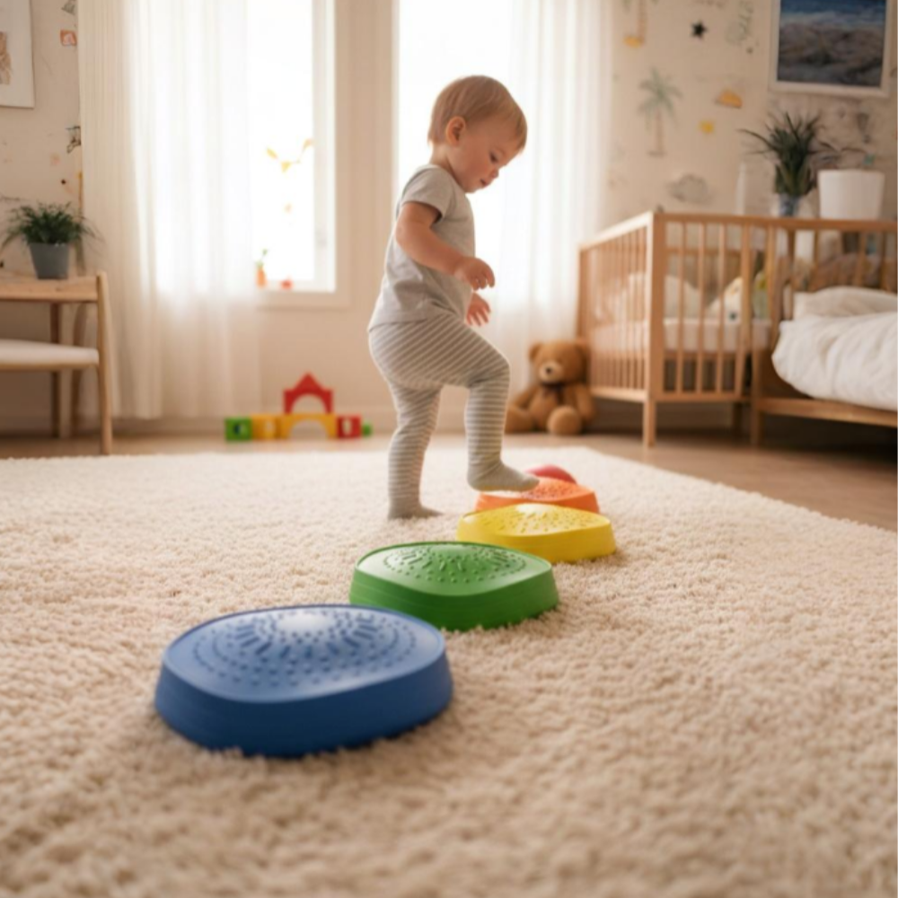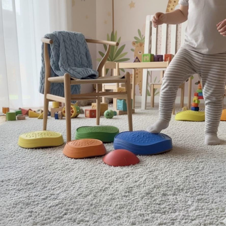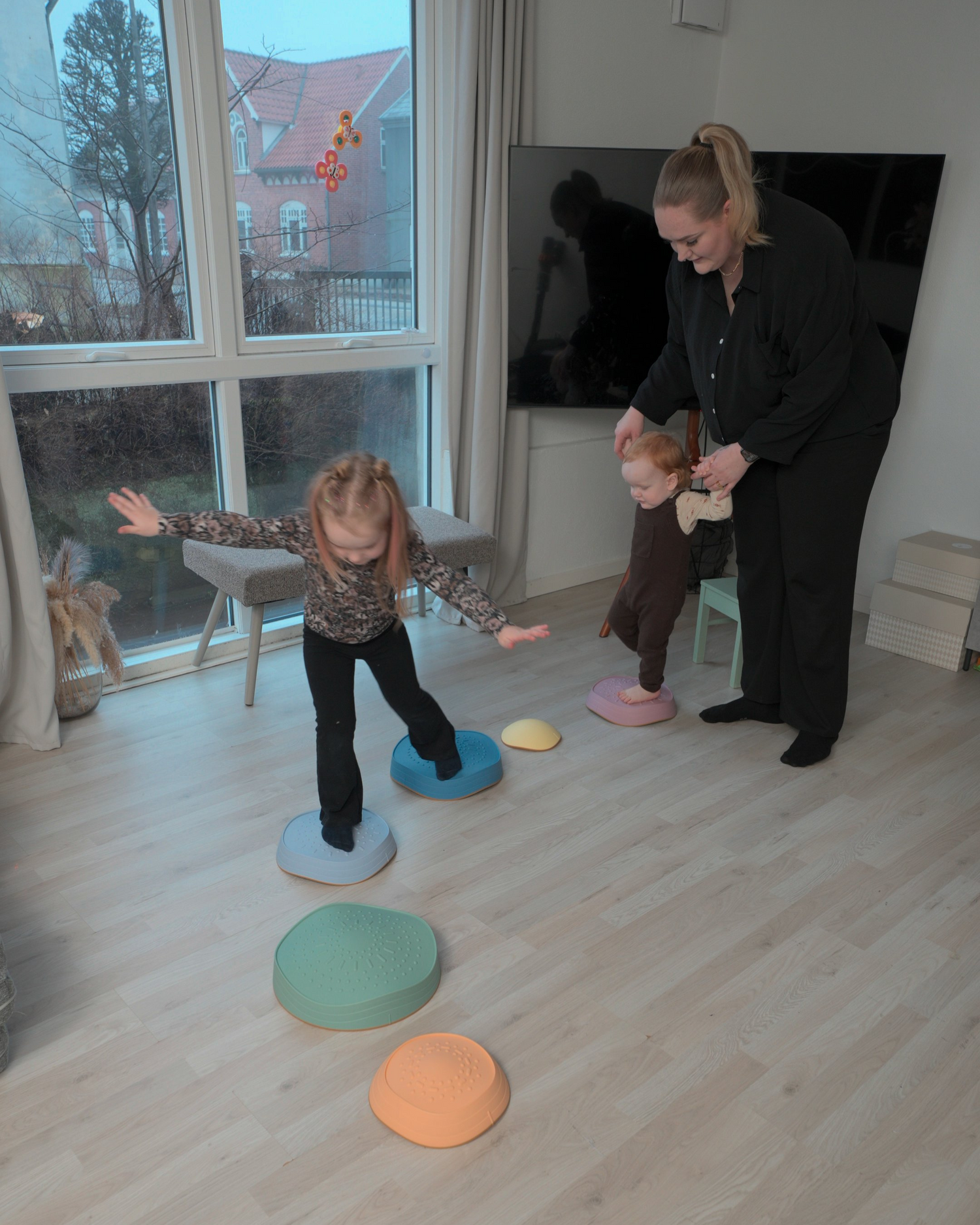 "Den taktila känslan, muskel- och ledkänslan sätts i spel när man leker med tumlestenarna. De tränar aktiveringen av de små, lednära musklerna runt fotled, knä och höft, som skapar stabilitet."